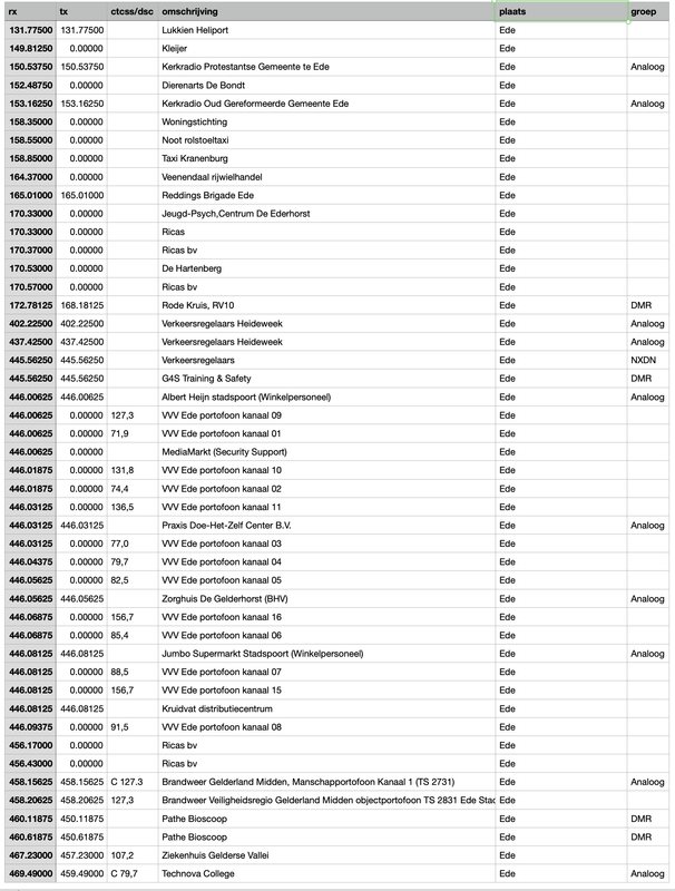 En dan uiteraard 700 andere kanalen met o.a. luchtvaart, marifoon, DMR, dPMR, repeaters etc.